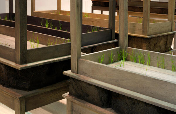 Plegaria Muda (2010) de Doris Salcedo. Esta instalación utiliza mesas de madera dispuestas en filas, con tierra y brotes de hierba que emergen entre ellas. La obra denuncia la violencia estructural y la pérdida de vidas humanas en contextos de conflictos armados y desapariciones, especialmente en Colombia. Salcedo crea un espacio de reflexión silenciosa que rinde homenaje a las víctimas, estableciendo un paralelismo con tumbas anónimas y la persistencia de la vida incluso en las condiciones más adversas.